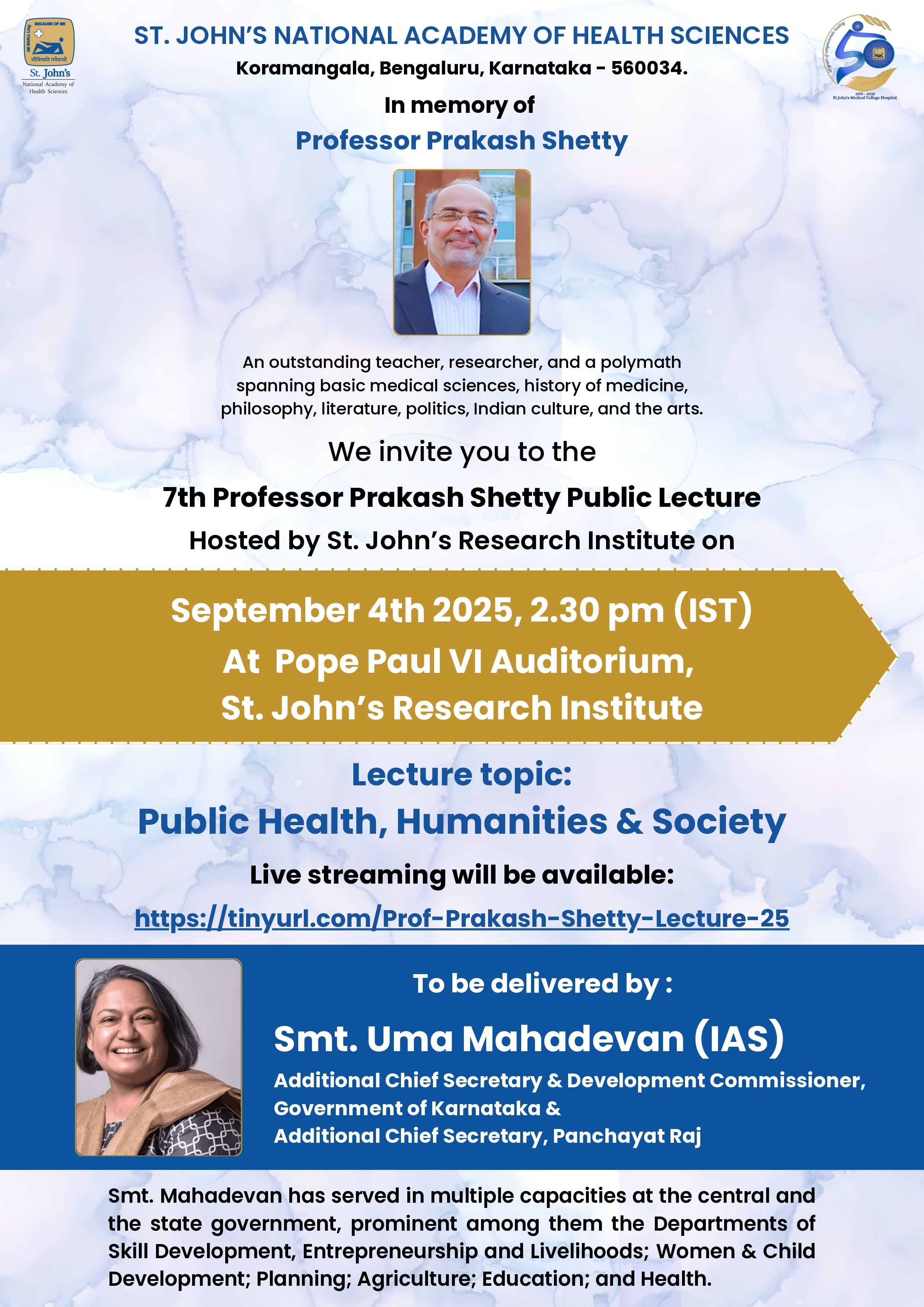 Venue: Pope Paul Auditorium, St John's Research Institute